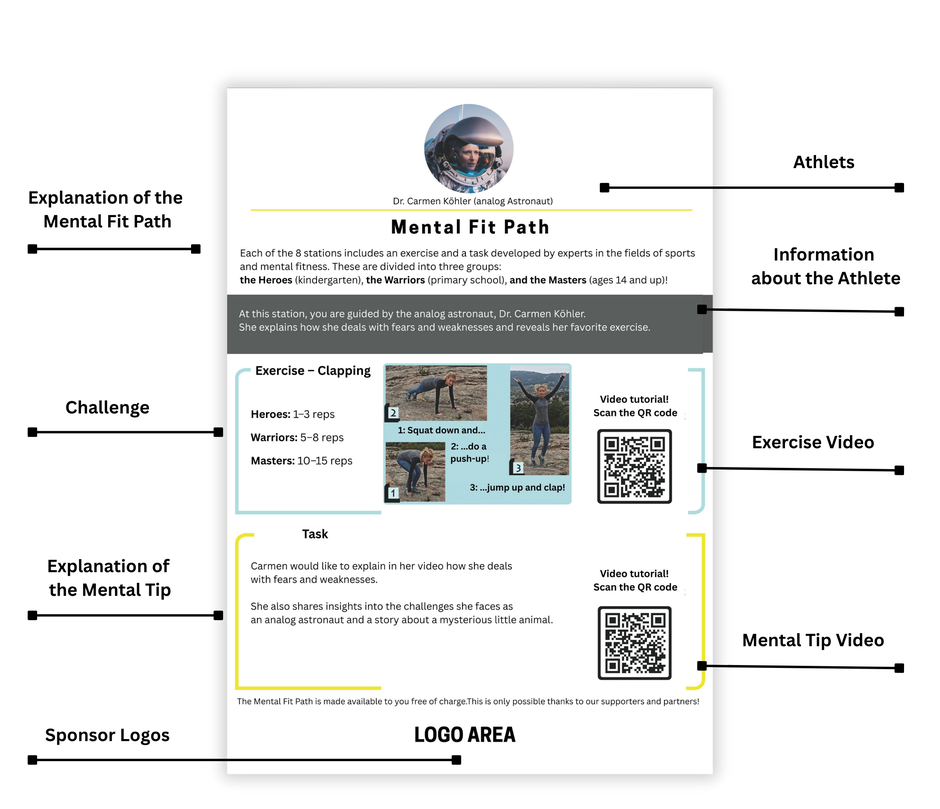 The Mental Fit Path was developed during the COVID-19 pandemic to get children and young people moving, to promote mental strength – and to build new bridges within society. People from elite sports, but also from the fields of culture, education, and science, share short video-based mental health tips directly within the movement-based parcours.